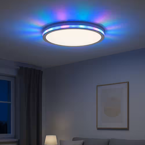 Vlakke LED plafondlampen met RGB-kleurwisselaars creëren een lichtsfeer die zich aanpast aan het moment. Kies tussen rustig blauw, levendig rood of creatief violet. Handige bediening via app of afstandsbediening.