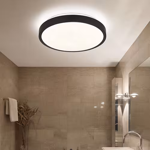 Plafondlampen in de badkamer vormen de basis. Ze verspreiden het licht gelijkmatig door de hele ruimte. Geen enkel gebied blijft in het donker. Goede plafondverlichting is essentieel, vooral in kleine of raamloze badkamers. Modellen met niet-verblindende kappen voorkomen fel licht. Dit creëert een aangename omgevingshelderheid.