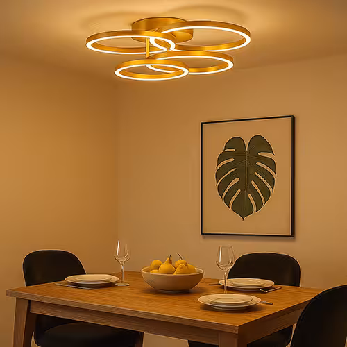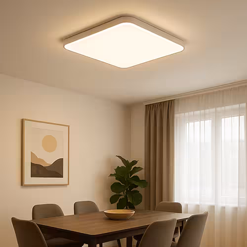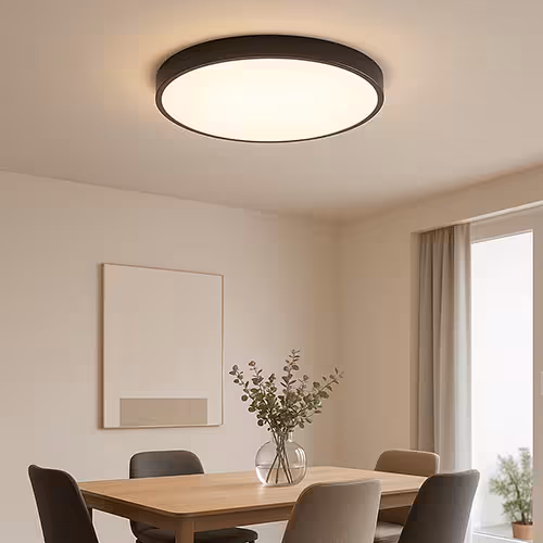 Plafondlamp eetkamer: Plafondlampen zijn ideaal voor gelijkmatige sfeerverlichting. Ze bedekken de hele kamer en creëren een heldere, vriendelijke sfeer.