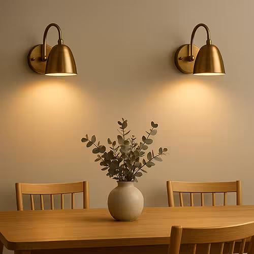 Wandlampen eetkamer: Wandlampen ondersteunen de hoofdverlichting of creëren gezellige verlichtingszones op specifieke punten. Ze creëren een aangenaam, niet-verblindend licht, vooral in kleinere eetkamers.