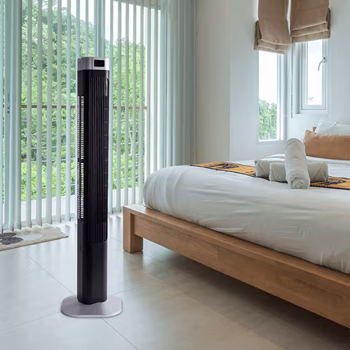 - Torenventilatoren: Plaats in hoeken van kamers of voor open deuren. Ze zuigen koelere buitenlucht de kamer in.